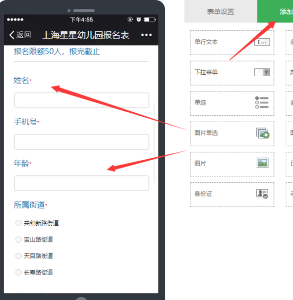 添加组件,这里就是粉丝或者用户需要填写的,商家可以根据自己需求,来添加组件,以及可自定义的文本、单选、多选,其中文本和单选/多选可反复添加,设置必填信息,达到收集各项信息的效果,并且可以上下调整顺序,详情参照图片