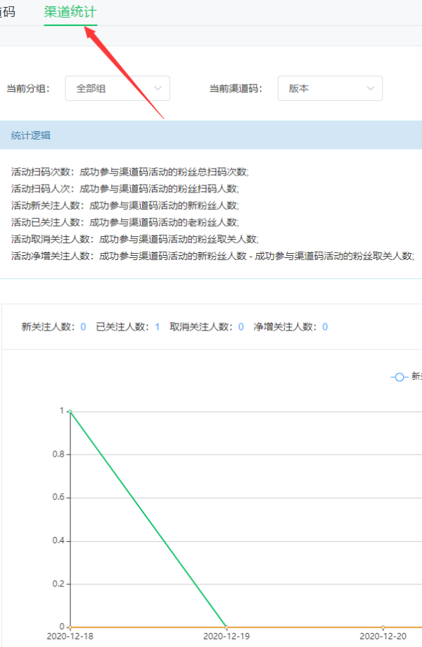 4.点击下载服务号生成带渠道二维码,扫码记录可以展示全部的扫码数据,包含增长取关数据、扫码关注时间等数据一目了然、数据曲线展示数据趋势,同时可将扫码记录导出到excel表格,方便后续分析使用。